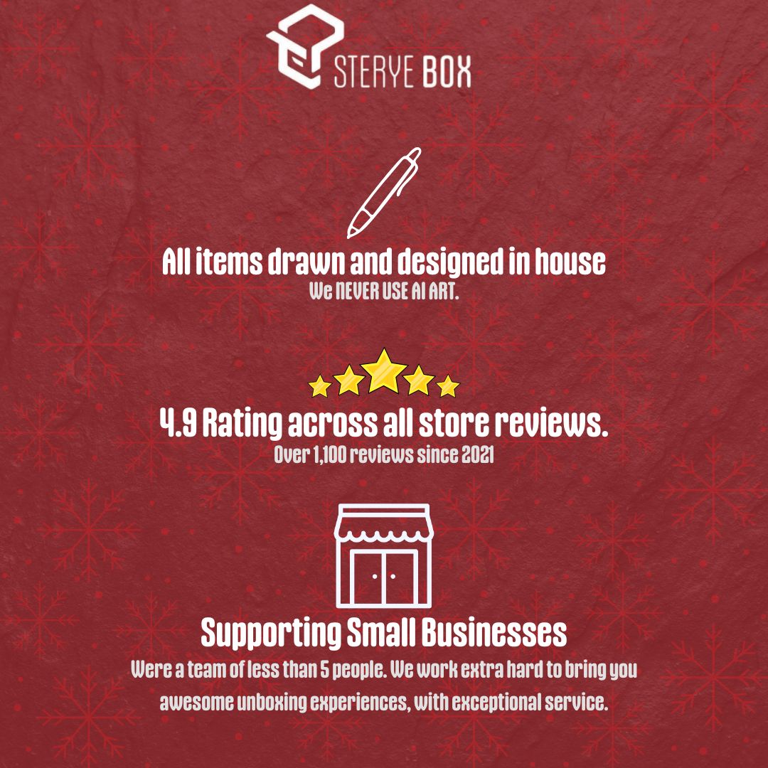 Our products change quarterly with different releases and drops. Check out our current mystery box line up under the shop section in our main menu, or home page.